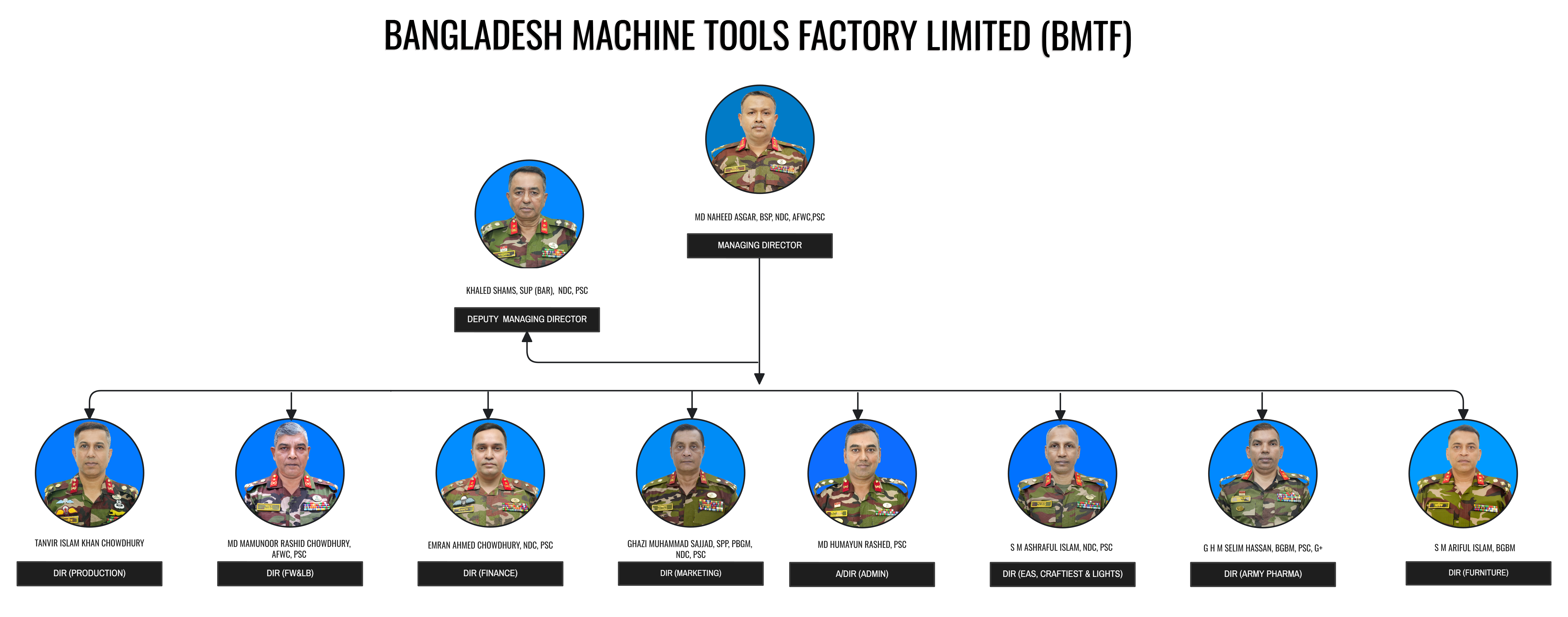 Bangladesh Machine Tools Factory Limited (BMTF) is one of the leading state-owned commercial entities operating under the management of the Bangladesh Army. Spanning 156.47 acres of land at Shimultoli, Gazipur, BMTF comprises 19 dynamic factories. Led by the Chief of Army Staff as the Board Chairman and with a Managing Director, BMTF is incessantly diversifying its enterprises to bolster the national economy and attain acclaim as a renowned conglomerate on a global scale.